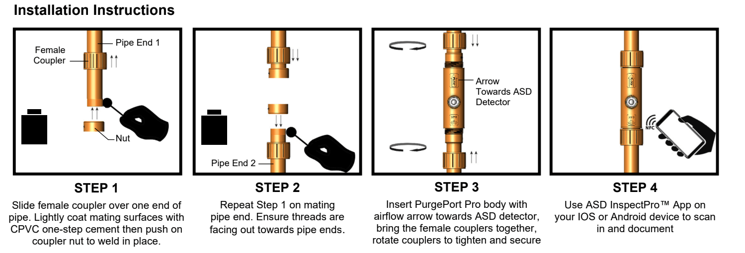 - Reduced Parts: Doubles up as an inline union fitting, facilitating disconnection of pipe from the ASD unit without disrupting pipe installation, detector, and without the need for additional components.